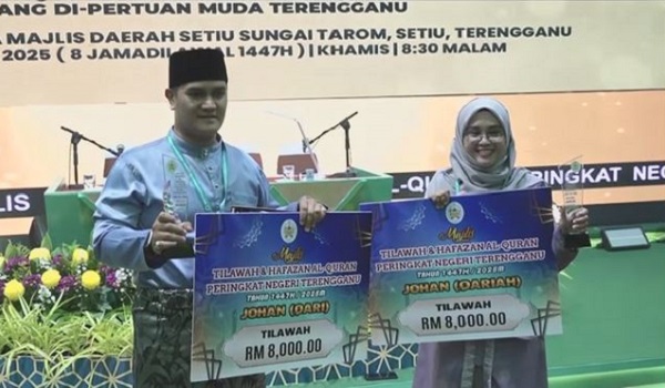 SETIU,31 Oktober - Qari Kuala Terengganu,Abdul Hadi Che Ab Halim dan qariah Setiu,Nur Jannah Ab. Rahman diumumkan sebagai johan bagi kategori masing-masing pada majlis penutup Majlis Tilawah dan Hafazan Al-Quran Peringkat Negeri Terengganu 1447H/2025M,malam semalam.
